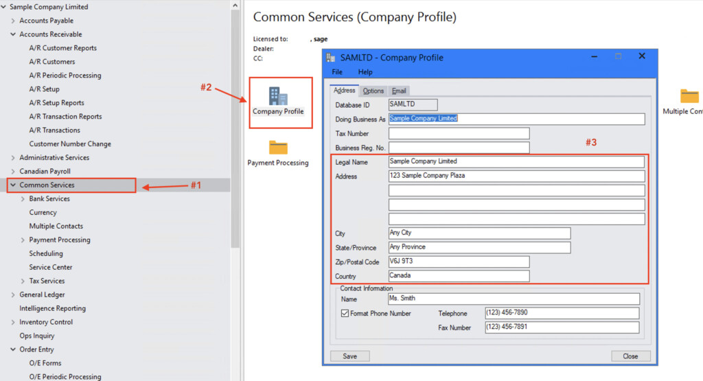 Navigate to Common Services > Company Profile and update the address information in the Company Profile dialog box.
