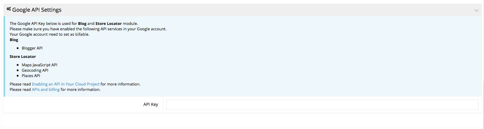 1) Before you can start using the Store Locator module you need to set up the Google API.