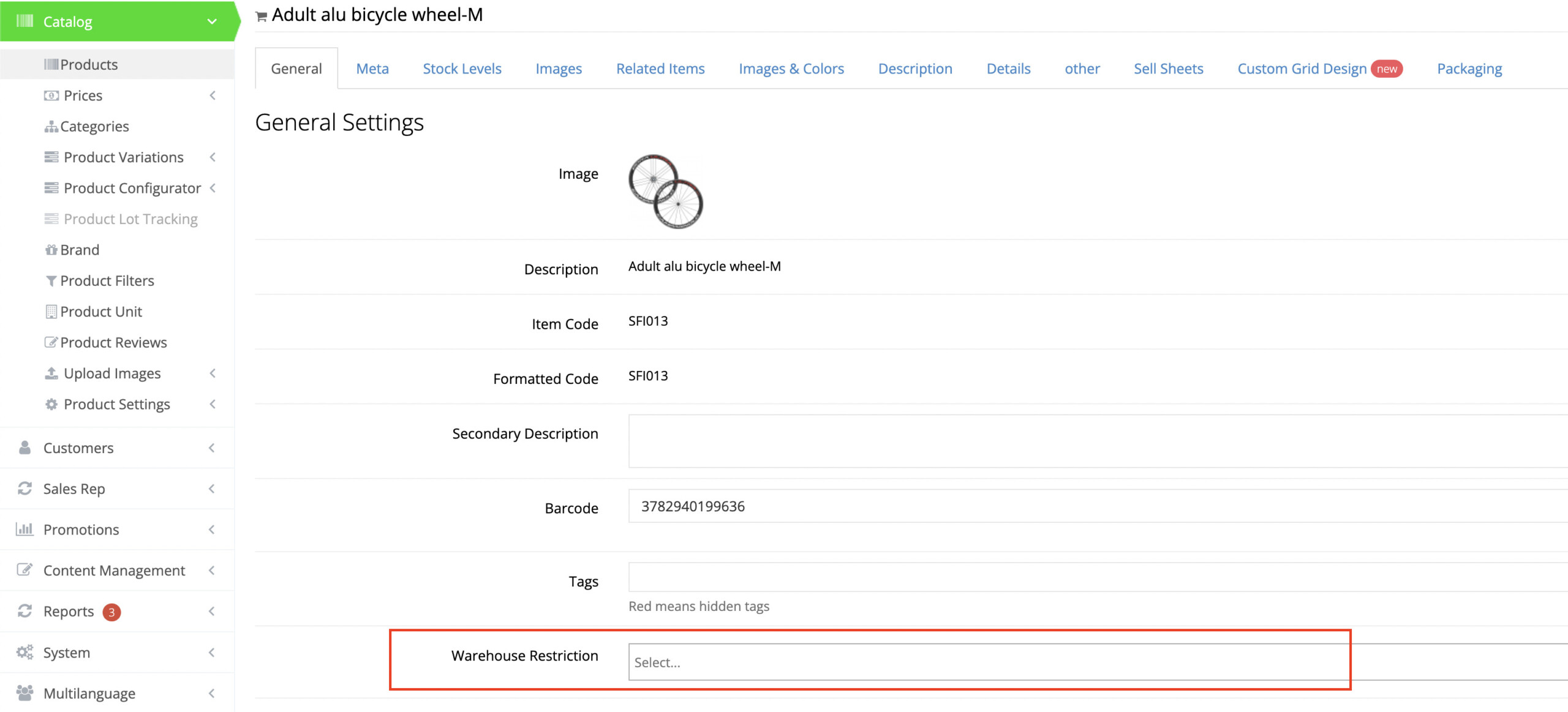 Once the feature has been enabled, you will have a new field called “Warehouse Restriction” when editing products under Catalog → Products.