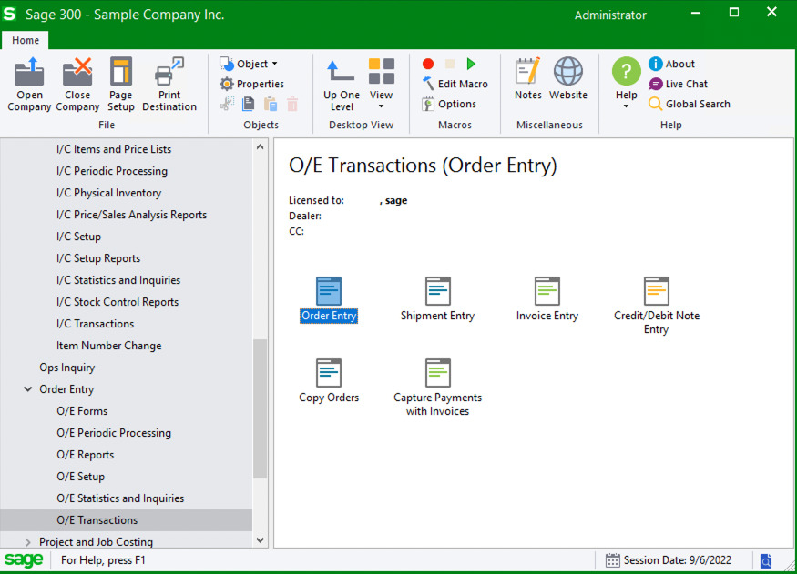 To provide us this information, open Sage 300, click Order Entry > O/E Transactions > Order Entry:
