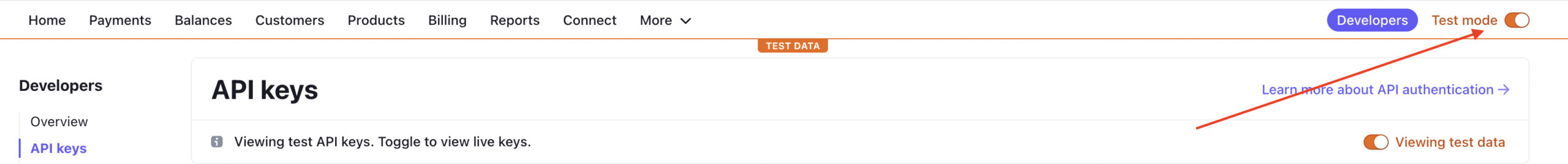 Log into your Stripe account and navigate to https://dashboard.stripe.com/apikeys. First decide if you want your account in “Test Mode” (for testing purposes). If so, be sure to toggle on that option.