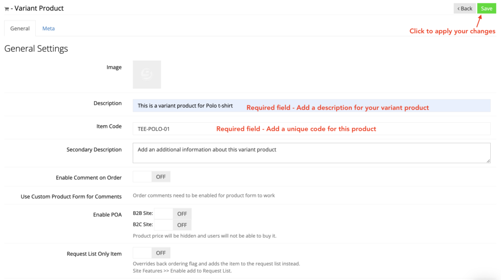 Once a variant product is created, additional fields and tabs are brought into view to add more information to the product.
