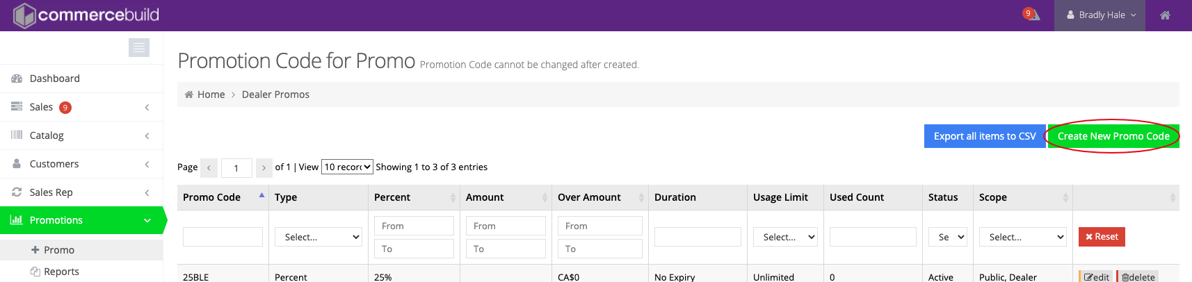 Once you have set up promotions in your web store, you are now ready to begin creating promotions. To start, navigate to Promotions > Promo > Create New Promo Code.
