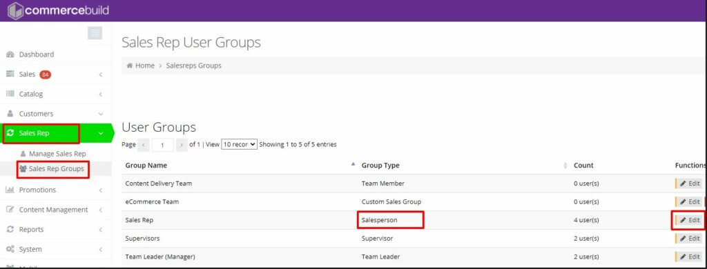 Admin>Sales Rep>Sales Rep Groups>Salesperson>Edit –