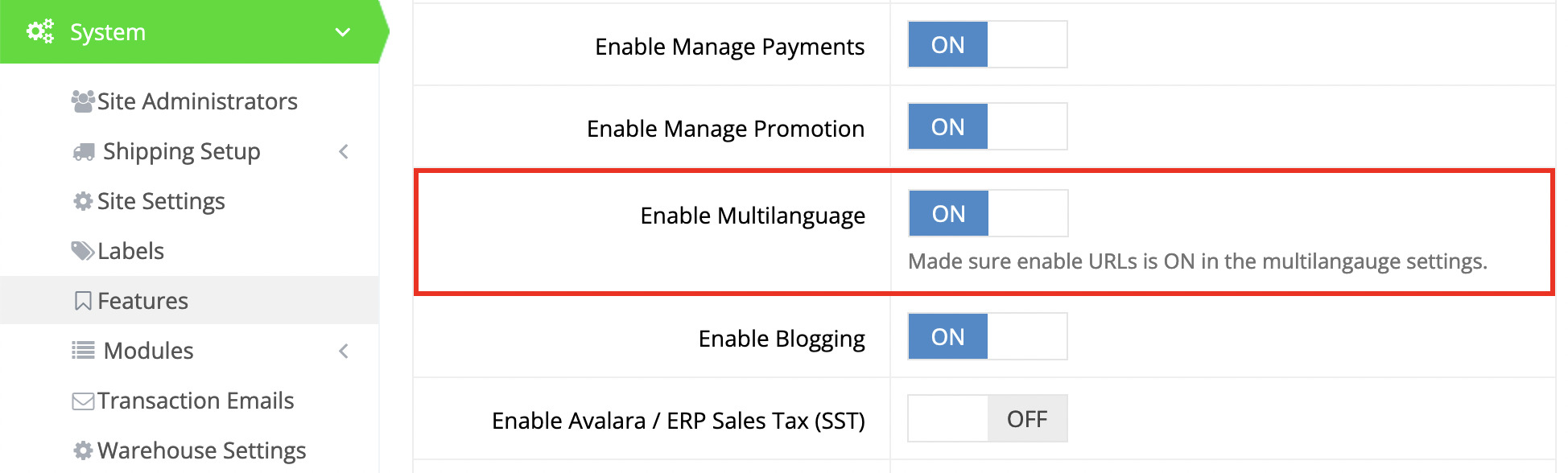 If you have not used Multilanguage on your web store, it is likely that it is not yet enabled. To enable it, go to System > Features and toggle on Enable Multilanguage.