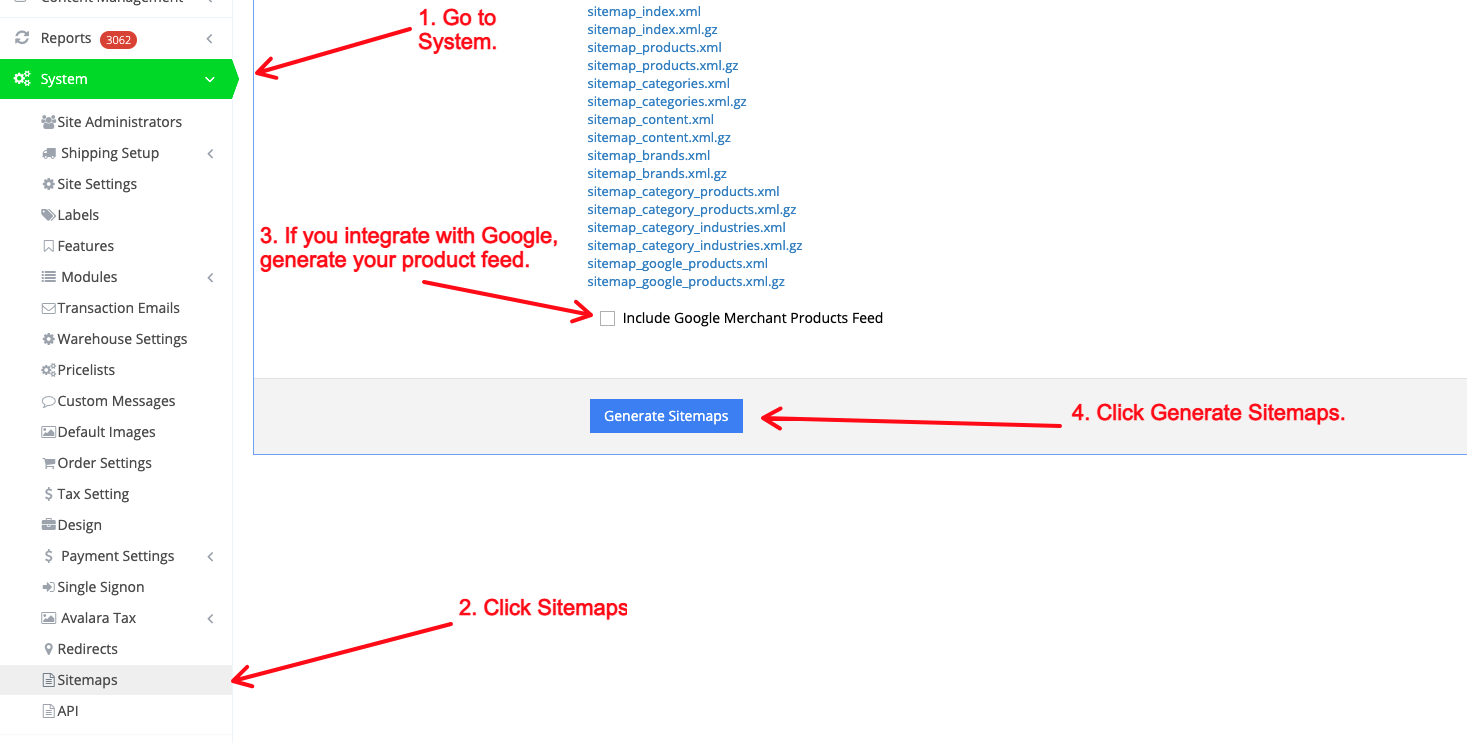 Home / FAQ, Tutorials / How to Generate Sitemaps and the Google Product FeedHow to Generate Sitemaps and the Google Product Feed 1275 views Less than a minute 0 To generate your sitemaps and Google product feed, go to System > Sitemaps and click Generate Sitemaps.