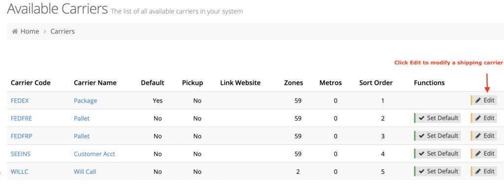 In your admin dashboard, navigate to System > Shipping Setup > Carriers. Click “Edit” next to a carrier you wish to modify to include the price range.