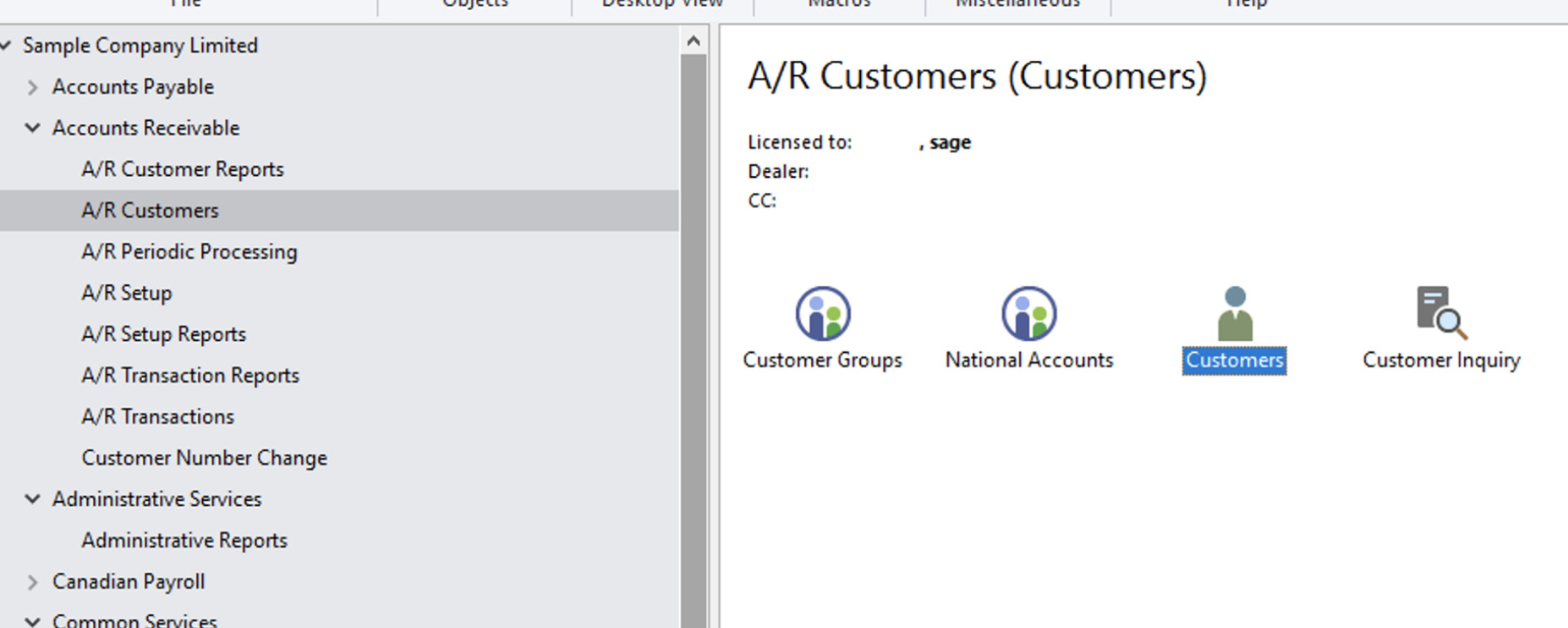 First, you will need to open Sage 300, and then navigate to Accounts Receivable > A/R Customers > and double click Customers.