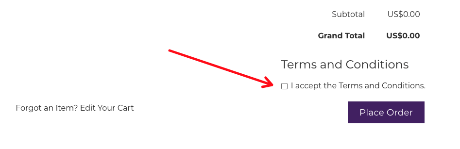 If you want to require your customers to agree to order terms and conditions, the web store offers this functionality in the final step of the checkout process.
