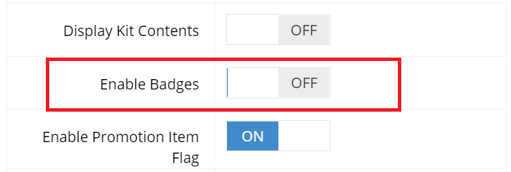 Under the General tab, locate a button for Enable Item Badge 1 and toggle it ON. If you are showing two badges, toggle ON Enable Item Badge 2 and so on for more badges.