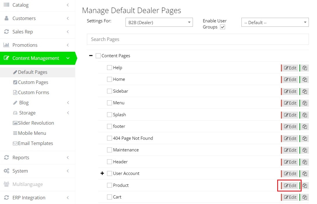 Navigate to the product template page: Admin >> Content Management >> Default Pages and click on the edit button.