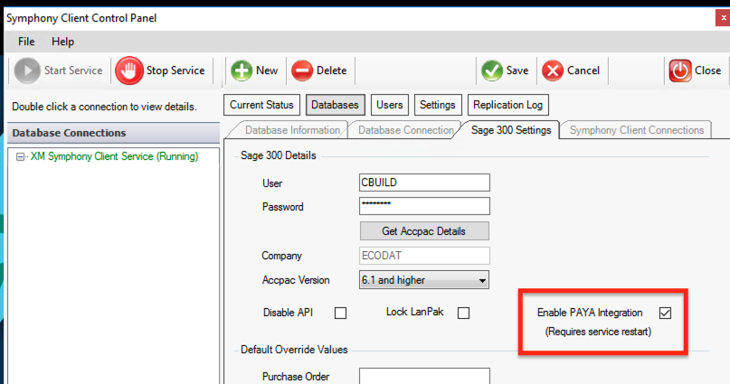 Open Symphony Client on the server and ensure that the “Enable Paya Integration” box is ticked under the “Sage 300” tab.