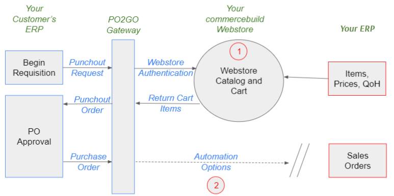 This allows your customers to easily create purchase orders or requisitions, and ensures that they have access to all of the products and prices available on your web store (see “1” in the process flow).