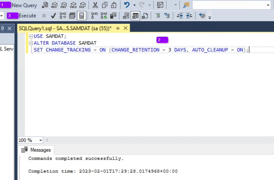 USE SAMDAT; ALTER DATABASE SAMDAT SET ALLOW_SNAPSHOT_ISOLATION ON; ALTER DATABASE SAMDAT SET CHANGE_TRACKING = ON (CHANGE_RETENTION = 3 DAYS, AUTO_CLEANUP = ON);![]()