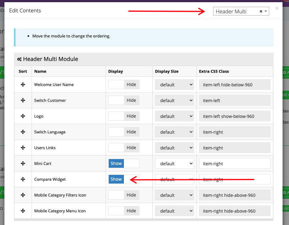 The Compare widget allows your customers to compare different products and their characteristics in a side-by-side table view. To activate this widget in the Header Multi module, toggle on Show for Compare Widget.
